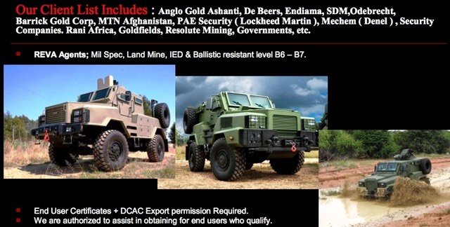 They specialize in armoring a variety of platforms ranging from SUVs to trucks and heavy equipment, SPECIALIZING in TOYOTAs, including air assets. UAEA delivers 25 armored vehicles per month. All our vehicles are battle proven in the Iraq , Africa & Afghanistan. Our clients include:: Non-Governmental Organizations (NGO), Private Security Organizations/Providers, International DefMin Departments, Government Agencies & Financial Organizations, Major Mining Groups