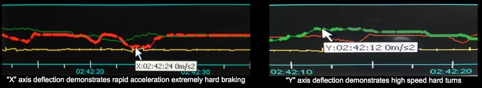 With a quick view the prescense of wide chart deflections can indicate dangerous driving behaviors that may indicate a need for additional fleet driver risk management driver education or training oversight by supervisors or in some cases management intervention in order to prevent those recorded and identified dangerous driving behaviors from creating a potential threat to life and limb, risk of capital investment in assets or liability lawsuits. Distracted fleet drivers often display hard braking as they are often not paying attention to the vehicle in front of them until they are about to hit it, hence the cause for the hard braking. Fleet driver risk management is enhanced when clear indications of dangerous driving behaviors can be identified prior to the accident scene reconstruction when it is already too late.